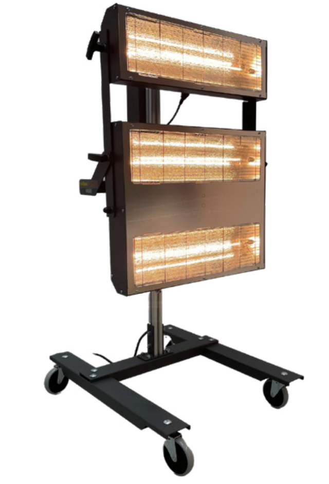 Our stand-up infrared unit features a unique dimpled sheet reflector that generates extremely even curing intensity and temperature over entire surfaces. This ensures the fastest possible curing time, while minimizing risk of over-curing or burning sections of your coating.