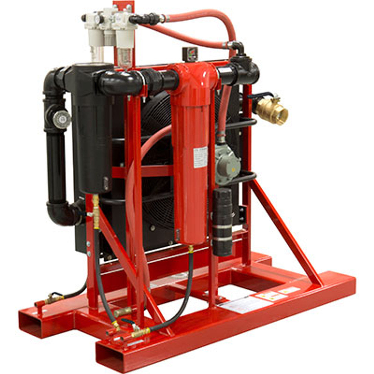 Pirate Brand® Dry Land™ After Coolers are a skid mounted system which includes an after cooler, a moisture filter, and a coalescing filter. Warm air enters the aftercooler where it is cooled to a 10°F to 15°F (5.6°C to 8.3°C) approach to ambient air temperature, water is condensed out during this cooling process. The saturated air and liquid water pass through a moisture separator where airborne water droplets are separated out. Next the air passes through a coalescing filter where any oil contaminants from the compressor are removed before it flows through the after cooler outlet.