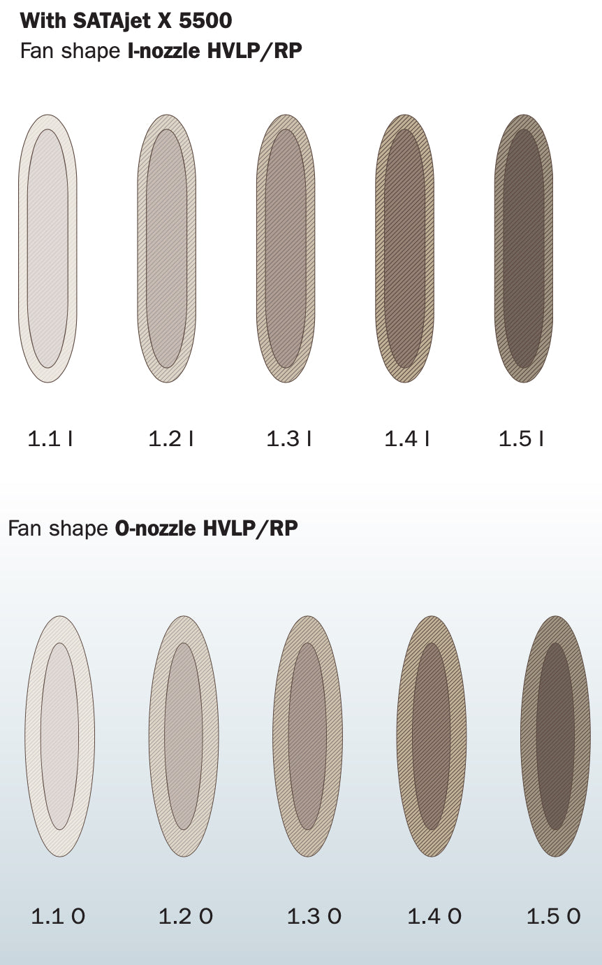 The concept of this nozzle system is easy and straightforward to understand: Both proven application technologiesHVLP and RPremain available, but now each of them offer the additional choice between I and O-nozzle sets. In line with the increasing nozzle sizes within each of the respective technology (HVLP / RP), the material flow rate increases with constant increments too. Which means that the spray fan size and width remain unchanged across the entire nozzle spectrum. In essence, end-users can now rely on a transparent and consistent system which offers them clear and well-structured application options.