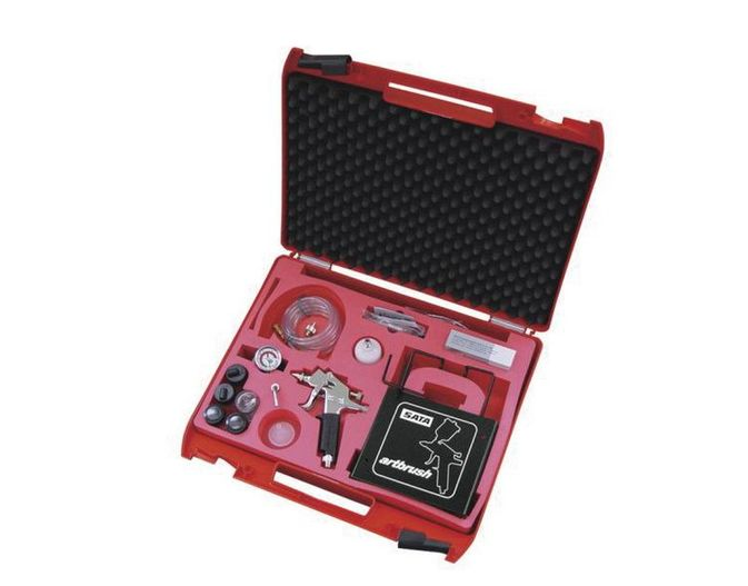 Description: The design set comes with the SATAjet 20 B spray gun,  0.5 nozzle, cups, gauge, funnel, 6ft hose, 0.2 nozzle (specify nozzle size) adapter, packing and cleaning set, & gun holder. This round spray design gun is perfect for vehicle murals, graphic design, calligraphy, airbrushing and many hobbies. The unique design of the SATAjet 20 B allows it to be used by left- or right-handed artists. The gravity cup is easily removed and an adapter switches it to a siphon gun with plug-in cups. These plug-in cups allow quick and easy changing of one color to the next.