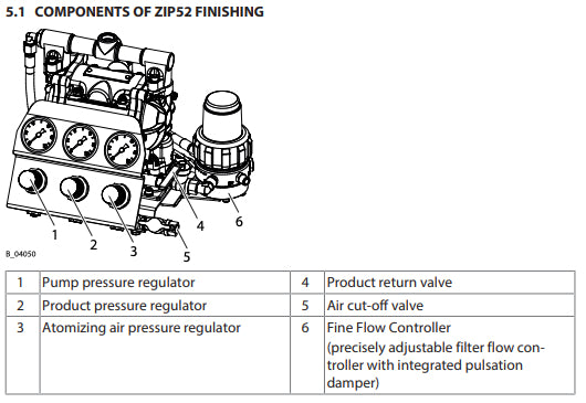 Descripción: Paquete de acabado ZIP 52 con FFC (controlador de flujo fino), regulador de aire, regulador de fluido y manguera de succión