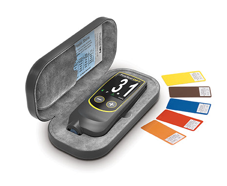 El medidor se entrega completo con correa para la muñeca, calzas de plástico de precisión, estuche rígido para guardarlo, 2 baterías alcalinas AAA, instrucciones, certificado de calibración de formato largo trazable a PTB, garantía de dos años.