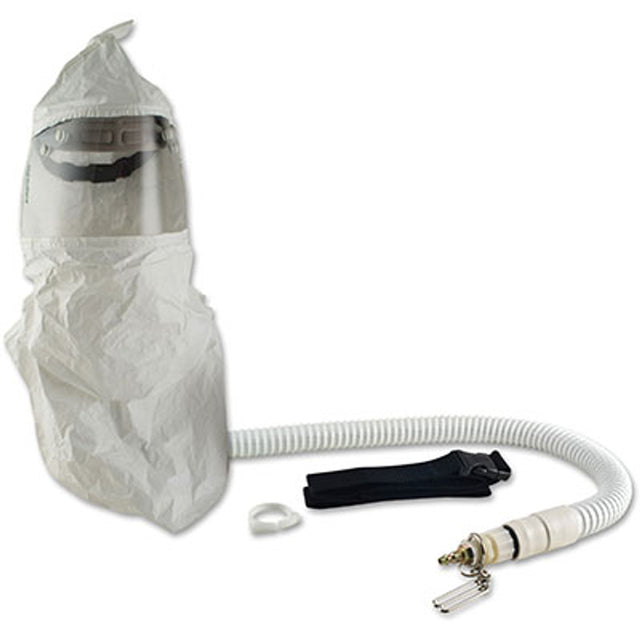 INCLUDES RESPIRATOR HOOD WITH SUSPENSION, BREATHING TUBE, BREATHING TUBE CLAMP, FLOW CONTROL DEVICE & NYLON BELT