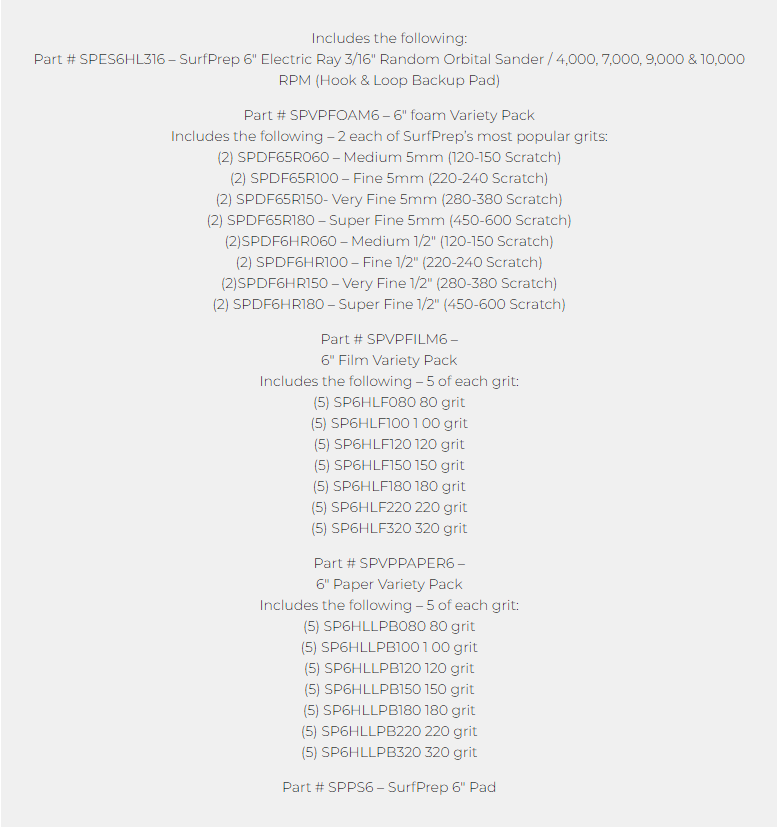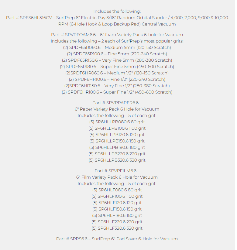 Los kits de sistemas de lijado de Surfprep son la mejor manera de comenzar a utilizar nuestros productos. Esto se debe a que usted elige qué lijadora funciona mejor e incluye los abrasivos y accesorios más populares para combinar con su herramienta. A continuación, deberá elegir el tamaño de lijadora que mejor se adapte a sus necesidades (*Sugerencia... la más popular es la de 3" X 4"). Luego, debe elegir el tipo de lijadora que funcionará mejor para usted. Si está debatiendo entre una lijadora neumática o eléctrica, mire este video para ayudarlo a tomar una decisión más fácil. Si está pidiendo una lijadora neumática, tenga en cuenta que necesitará, como mínimo, un compresor de aire de 80 galones .