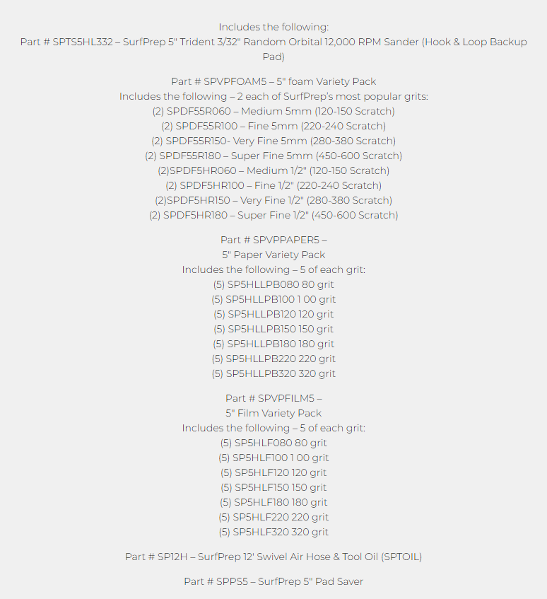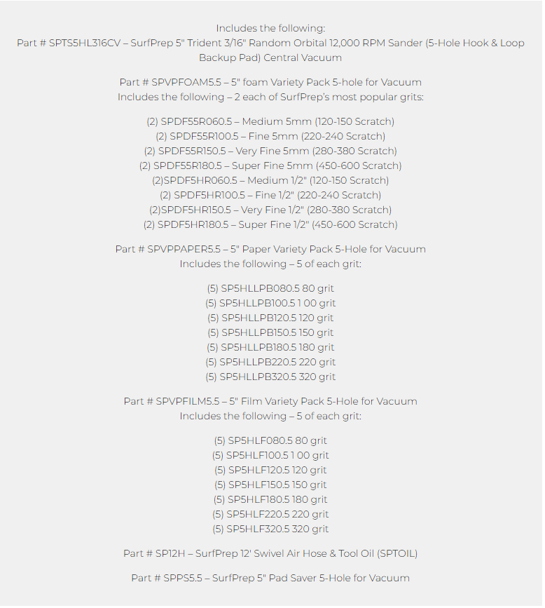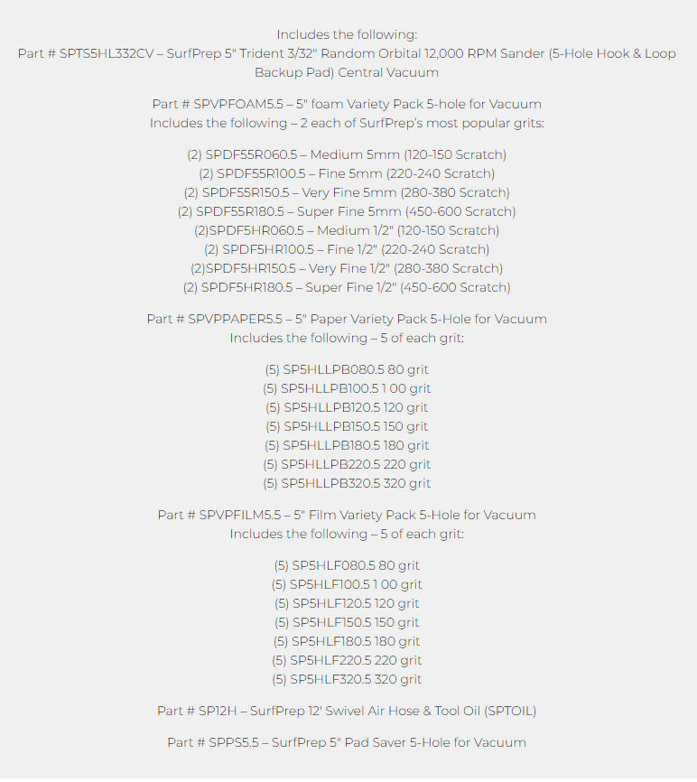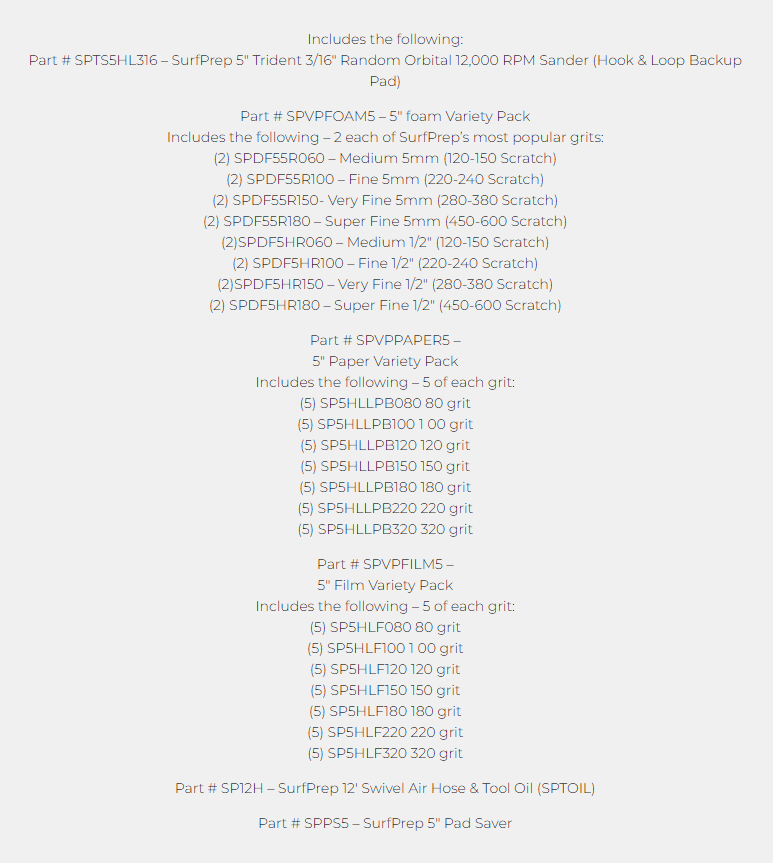 Los kits de sistemas de lijado de Surfprep son la mejor manera de comenzar a utilizar nuestros productos. Esto se debe a que usted elige qué lijadora funciona mejor e incluye los abrasivos y accesorios más populares para combinar con su herramienta. A continuación, deberá elegir el tamaño de lijadora que mejor se adapte a sus necesidades (*Sugerencia... la más popular es la de 3" X 4"). Luego, debe elegir el tipo de lijadora que funcionará mejor para usted. Si está debatiendo entre una lijadora neumática o eléctrica, mire este video para ayudarlo a tomar una decisión más fácil. Si está pidiendo una lijadora neumática, tenga en cuenta que necesitará, como mínimo, un compresor de aire de 80 galones .