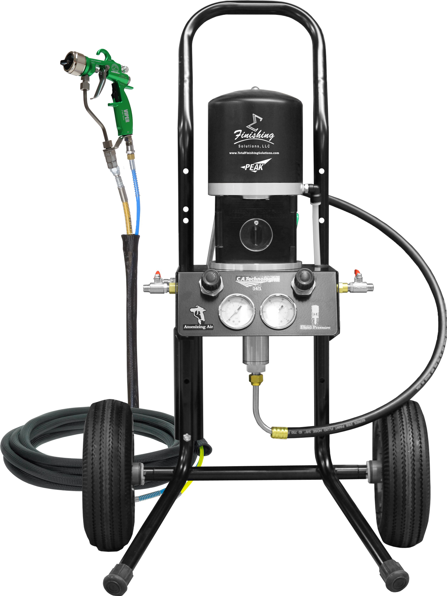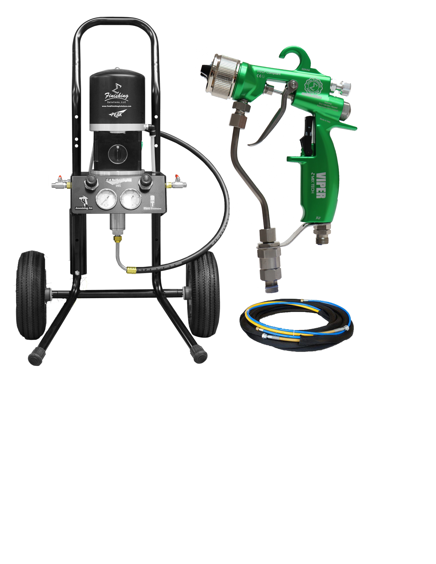 Bomba con pulverizador sin aire asistido por aire (AAA) 14:1 Peak™ con etiqueta TFS: configuración de modelo de carrito (empaque en V) con pistola pulverizadora VIPER® AAA