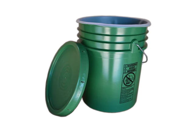 Nuestro contenedor de polietileno de 5 galones es el balde estándar de BECCA. El balde viene con una tapa y un revestimiento.