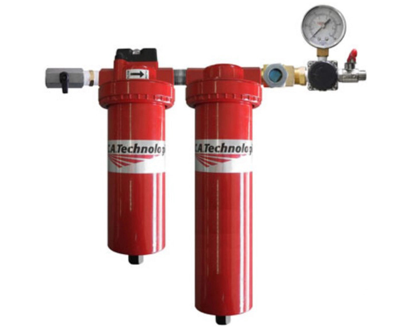 Secador de filtro de aire CA Technologies parte 52-531. Esta unidad es un filtro de aceite/agua de dos etapas de uso puntual con un cartucho desecante de secado para operaciones de pintura con una sola pistola donde el aire seco y limpio es fundamental, como en el acabado de automóviles o de madera fina. La unidad desecante tiene un indicador que muestra cuándo la unidad está saturada y necesita ser reemplazada. La unidad viene con una válvula de bola en la entrada y un regulador para la regulación con una sola pistola. Esto es lo que todos los acabadores finos deberían tener. El flujo máximo es de 25 SCFM y está clasificado a un (1) micrón.