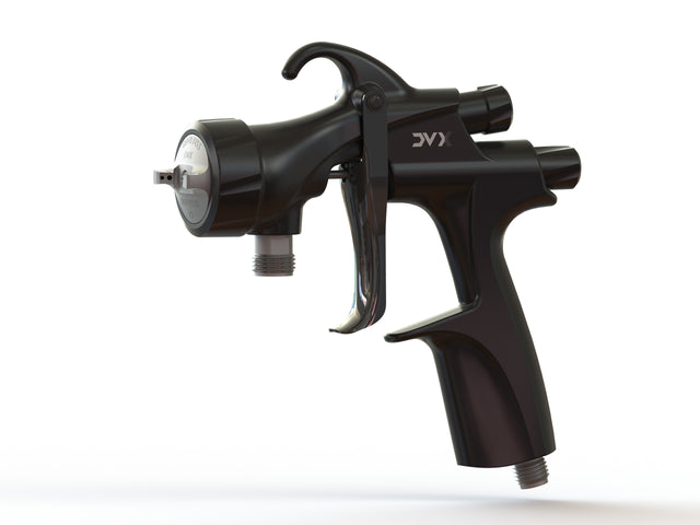 Description: The new DVX series revolutionizes air spray guns for the industrial market. The innovative redesign of the fluid body and air caps allows us to mitigate turbulence that occurs between the paint and air when the trigger is pulled. More efficient air flow paths reduce separation and stagnation zones. The result is higher flow rates for faster application, higher transfer efficiency to reduce material use, the most consistent pattern on the market, and the best spray finish quality ever.