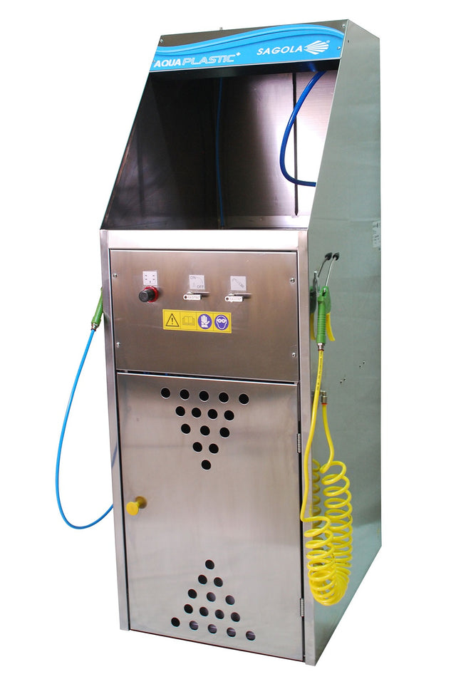 Description: Designed to clean spray guns and accessories when working with waterborne products. Easy cleaning of the dirty water by mixing it with the floculant through a pneumatic system, separating completely the paint and pigment residues.