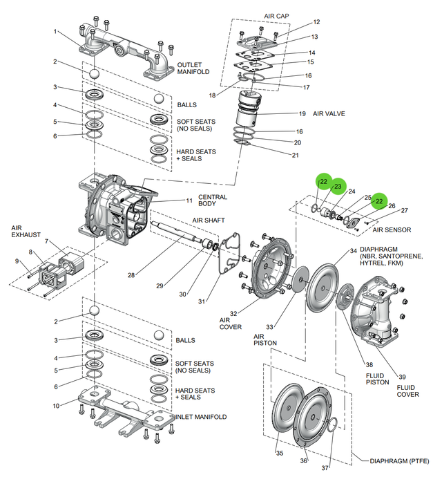 Description: Air Sensor Seals Kit. For use with UP10 Pivot Series 1" Metallic Air-Operated Double Diaphragm Pumps
