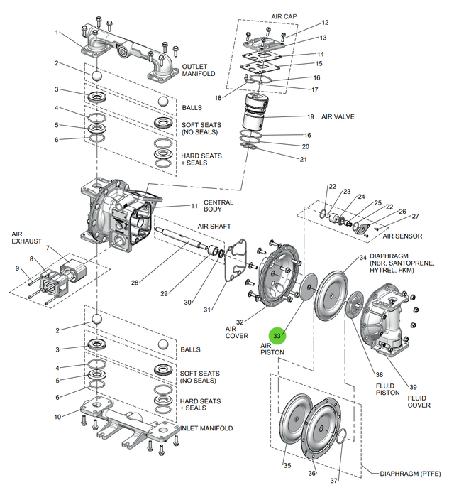 Description: Air Piston Seals Kit. For use with UP10 Pivot Series 1" Metallic Air-Operated Double Diaphragm Pumps