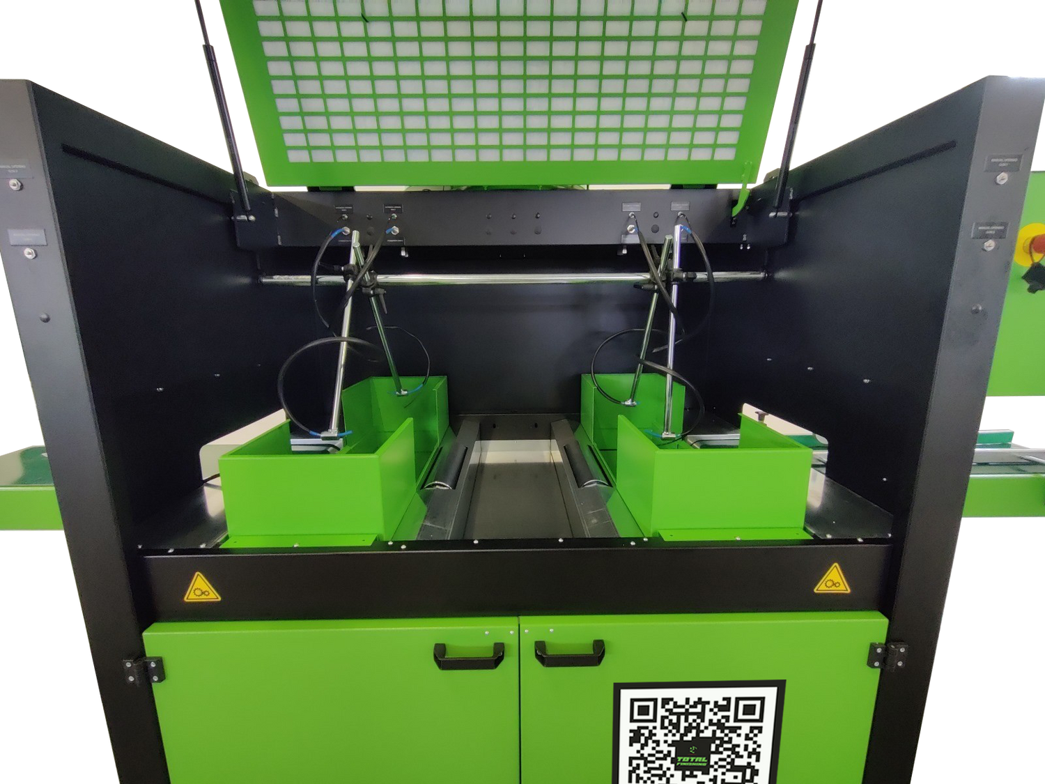 - Suction tower attached to the machine base on the rear part of the spraying booth, equipped with filter holder frames and electric fan; the filter holder frames can be extracted at the outfeed side of the machine, parallel to the feeding direction. Electric fan placed on the suction tower, with adjustable horizontal outlet (excluding exhaust pipes).