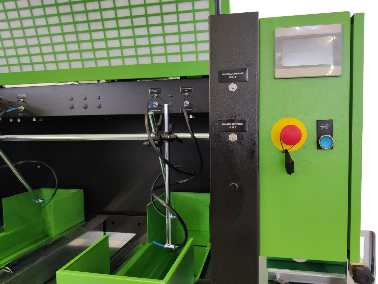 - Spraying booth equipped with an opening door with upper hinges, complete with gas springs, with front tempered glass on the door, all assembled with a special gasket; net booth ceiling, equipped with filtering sponge.