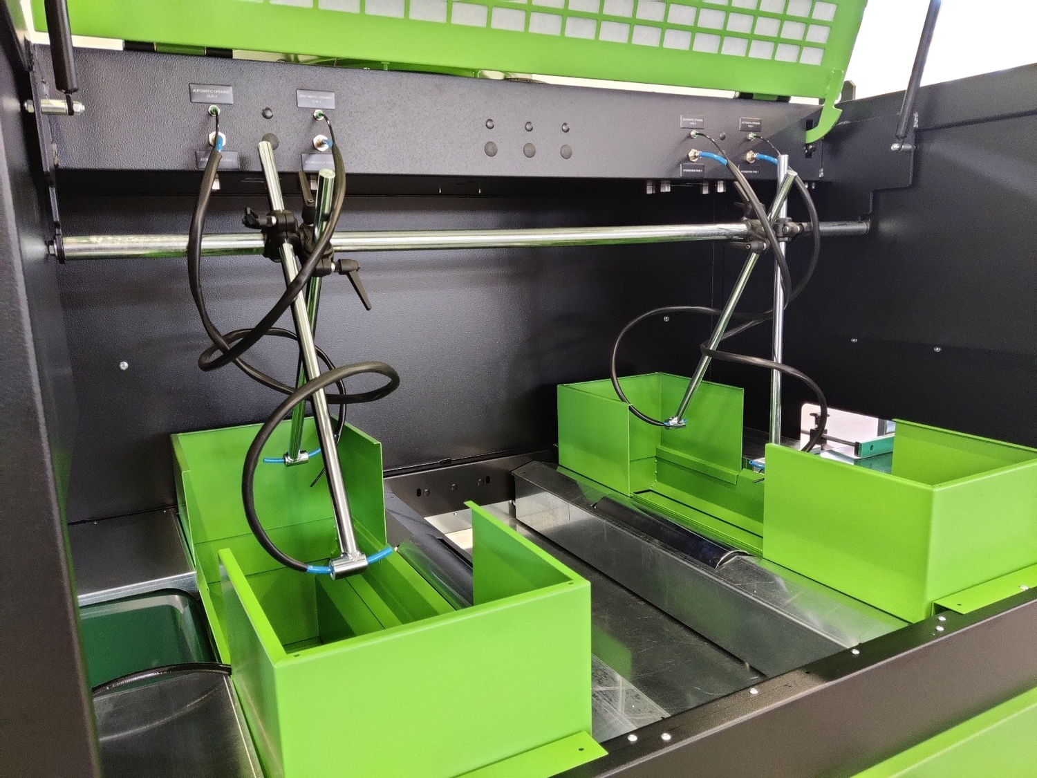 - Fixed suction trolley integrated in the machine equipped with a suction opening towards the rear suction tower, as well as with front removable panel. The suction trolley has got on the upper side, inside the cabin, 2 suction channels, 2 tanks for paint drain, and relative tank covers, all removable from inside the cabin.
